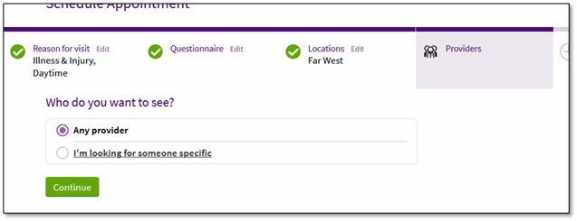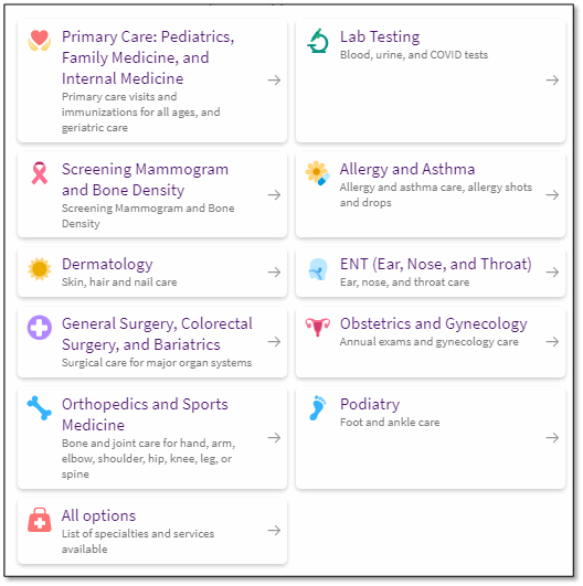 More convenient appointment choices: The appointment reasons have now been grouped by specialty and service. Primary care contains visit options for Pediatrics, Family Medicine, and Internal Medicine. Each specialty and service tile contains its related visit options.