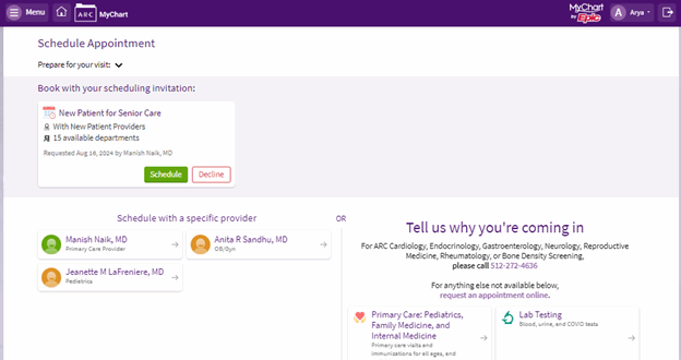 You can schedule primary care, same-day, and many specialty appointments directly through ARC MyChart.