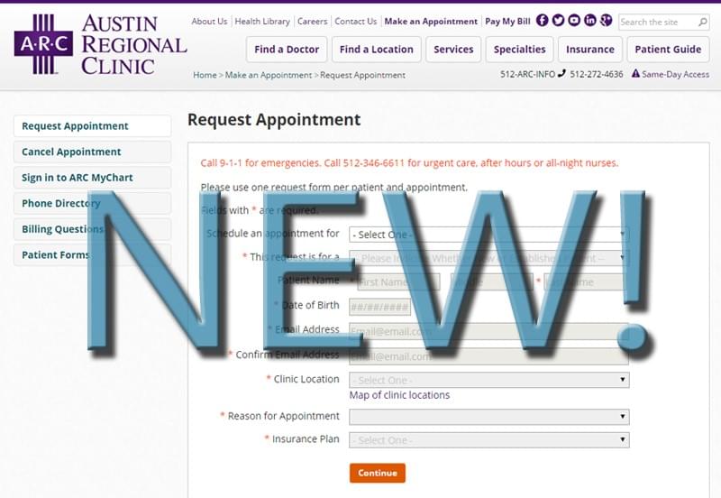 Austin Regional Clinic is excited to introduce our new secure online appointment request system making scheduling appointments for you and your family quicker and easier than before. We encourage you to use MyChart to book most appointments with your primary care doctor. For specialty care appointments and for most complex primary care appointments, you can use our improved online appointment request system.