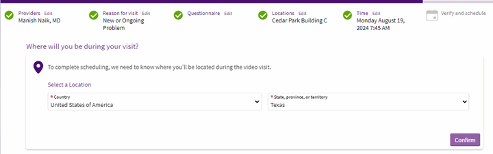 Confirm your location for video visits: There is a new screen when scheduling a video visit. You’ll select where you’ll be located at the time of your video visit.