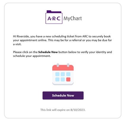 When we refer you to a specialist or remind you it's time for a specific appointment, a scheduling ticket will be sent to your email. ARC MyChart users will also receive a notification and see a message on the MyChart homepage.